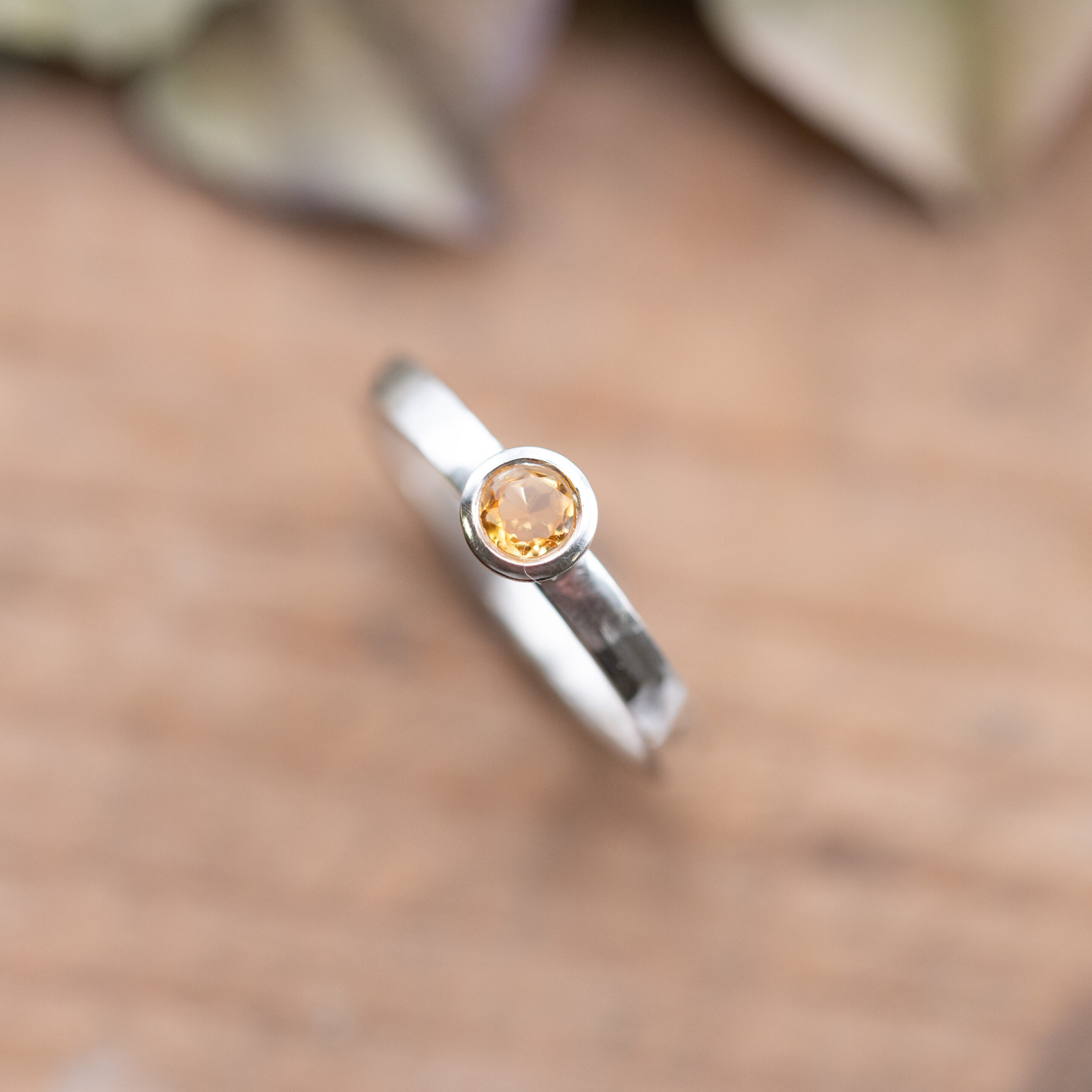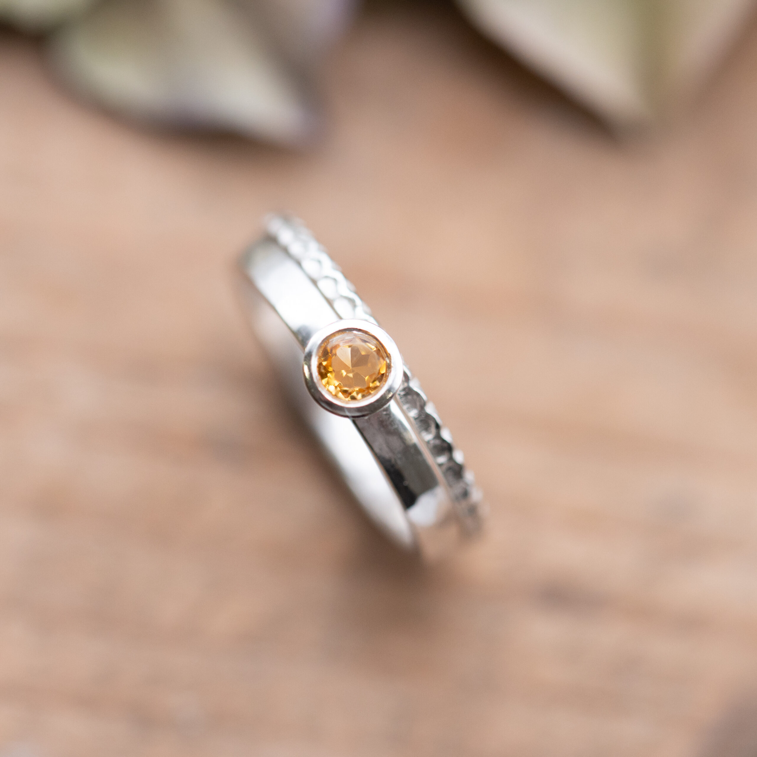 Silberring mit Hammerschlagoptik, mit einer schlichten Fassung, in die ein Citrin eingefasst ist.